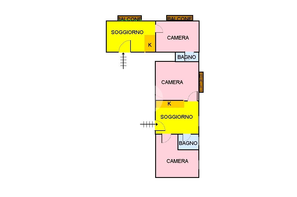 L'appartamento è attualmente suddiviso in due unità indipendenti, entrambe con ingresso separato, rendendo la proprietà versatile. La prima unità è un monolocale con ingresso in soggiorno , cucina abitabile con balcone, camera matrimoniale con affaccio su Corso Umberto e bagno. La seconda unità è un bilocale con ingresso in soggiorno con angolo cucina con finestra, camera matrimoniale con balcone su Vico dei Costanzi, una seconda camera matrimoniale con finestra e bagno finestrato.
